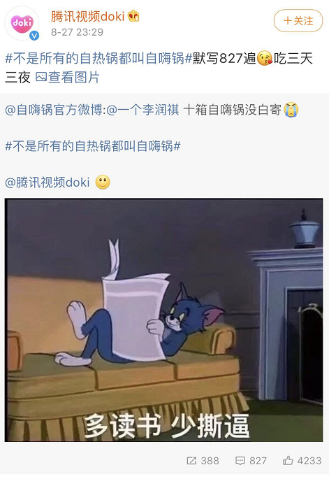 对于这一乌龙事件,腾讯视频doki迅速在自嗨锅的微博下留言道歉,“#不是所有的自热锅都叫自嗨锅#默写827遍,吃三天三夜”,并在配图中可怜巴巴叫“爸爸”求饶过。大气的“金主爸爸”自嗨锅则调侃回复道“谁偷了我们小锅锅的自嗨锅?”可怜doki还有“猪队友”腾讯综艺来跟风“晚上你就多吃点”,引得“金主爸爸”自嗨锅转而帮腔道“你不跟着一块吃吗?”