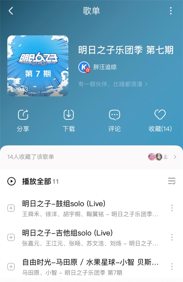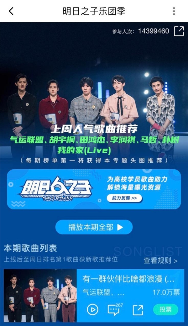 上周节目中,《明日之子乐团季》高校司职表演秀点燃热血,学员们亮出“看家本领”给观众带来一场颠覆感官的乐团盛宴。6组乐团还演绎了6版全新的《有一群伙伴比啥都浪漫》,彰显独一无二的魅力,其中,气运联盟乐团(胡宇桐、田鸿杰、李润祺、马哲)带来的R&B版《有一群伙伴比啥都浪漫》引爆心动,凭借17.5万助力值再度问鼎酷狗音乐《明日之子乐团季》互动专区,成功解锁酷狗【专题页头图】【独家制定宣传海报】【认证官博】等推广资源,未来可期!
