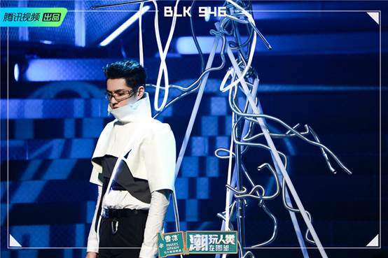 面对抽象的“跨古今”主题,吴建豪NO.W厂牌选择以“时间概念”进行破题。于是,历史知识点“结绳记时”成为NO.W厂牌首套潮LOOK的点睛设计。第二套LOOK则通过黑红线条穿插不对称的视觉设计,狂乱野性不羁的面罩等来表达“人类以多元化的存在状态,精确地矗立在时间轴上”的概念。吴建豪、徐艺洋则演绎了人类与时间、环境产生了共生与连接的未来状态。吴建豪暗黑系眼妆配以裸色原始唇妆,徐艺洋则以桃色夸张眼妆配复古花瓣唇,二人眼神犀利气场全开,超越时空的冷峻之美呼之欲出。作为“跨古今”系列作品的见证者与呈现者,徐艺洋感慨自己“从未有过如此正式的走秀。作品很高级,在贴合主题的基础上,既有古典美,又有现代的美感”。NO.W厂牌的整体性以及超额完成的两套服装,引得李灿森惊叹“自然、漂亮,怎么能在同样的时间里做出五套衣服?”。