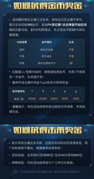 花椒直播吃鸡赛的参与激励分为金币奖金和击杀奖金两个部分。每位主播有3次生命,每次生命初始值均为100金币,通过发起PK排位赛或点击弹窗随机匹配对战,胜利者可获得对方全部金币;若打成平局,双方金币均减半;如果不幸失败,损失的金币将全部转给对方,同时生命值也将减1,失败3次即为淘汰。比赛兼具随机性和结果即时反馈,赢者通吃的同时,又可通过“斩杀”登上另外榜单,不同的策略将得到不同的奖励,为每天的主播连麦互动带来了更多看点。