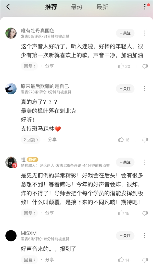 原创作品《真的忘了》上线酷狗音乐后,网友们纷纷涌入评论区“报到”,并高呼“今晚好声音的惊喜”,少年们的声音干净动听,“第一次听就喜欢上”,简直听入迷了!