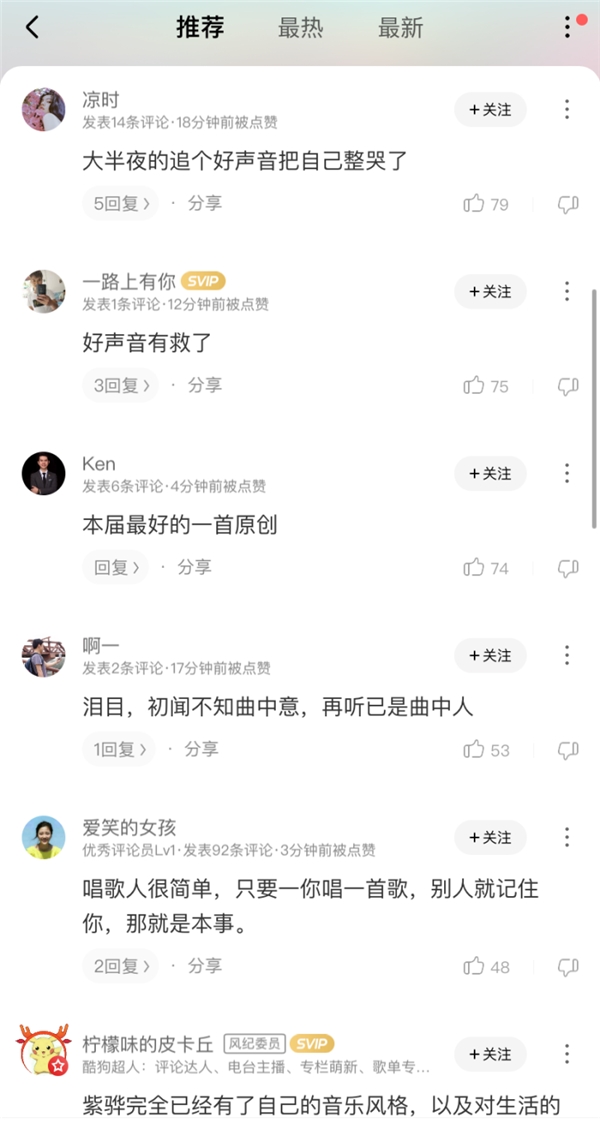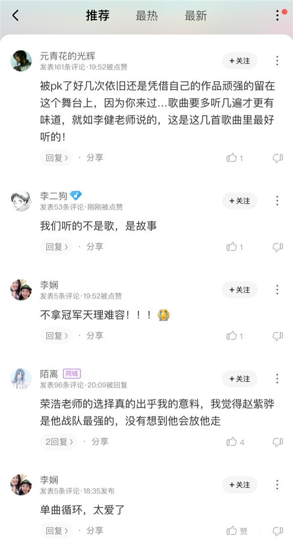 在酷狗音乐,治愈力满分的《因为你来过》也被网友加进单曲循环列表,有人表示在这首歌里听到的是故事,简直“太爱了,不拿冠军天理难容”!