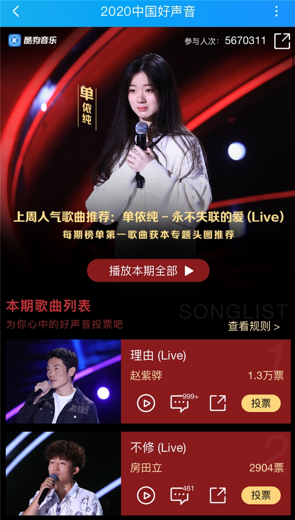 大受欢迎的《理由》,也在酷狗《2020中国好声音》互动专区大放异彩,以高票当选本期互动专区Top1,如无意外的话,他将解锁【专题头图推荐】酷狗独家曝光资源。
