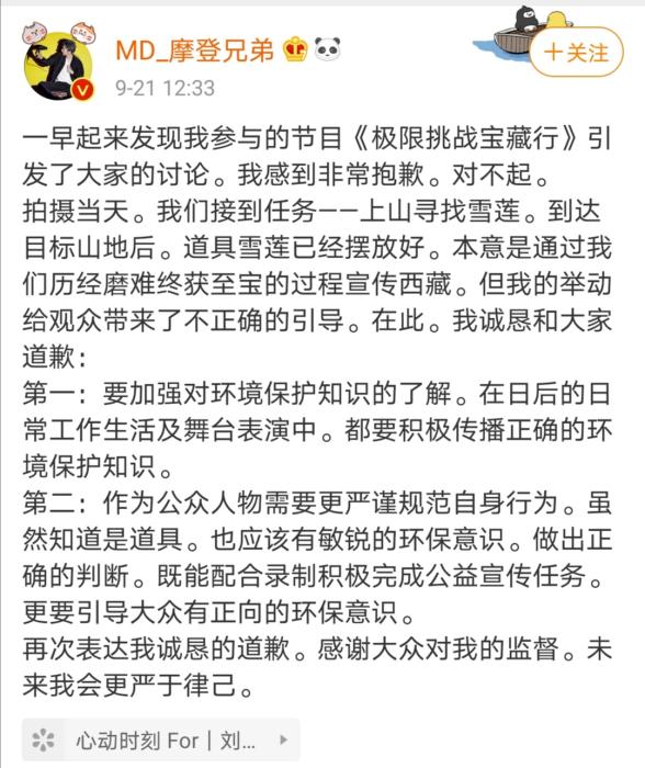 他提到,节目本意是通过大家历经磨难终获至宝的过程宣传西藏。但自己的举动给观众带来了不正确的引导,因此向大家道歉。他还强调,自己在未来的生活和工作中,都要积极传播正确的环保知识,也会更加严于律己。