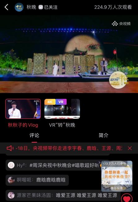 国际在线消息:9月16日至18日,央视频探访了紧张录制中的2020年中央广播电视总台中秋晚会,并据此展开了为期三天的探班秋晚网络直播活动。直播采取“秋秋子的vlog”与VR全景4K快慢双直播并行的创新形式,加之其内容的年轻化创新表达收获广泛赞誉。探访直播活动中,囊括了央视频对央视中秋晚会彩排录制花絮的实地报道及对相关演职人员的采访,直播最高在线收看人数突破224万人,其中参与投票互动人数超百万。由央视频直播内容引发的“央视镜头下的鹿晗”、“王源没有主持人证”等话题更是陆续登上了全网各大平台热搜榜单的高位,掀起了一波全民追看秋晚的热潮。