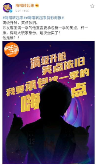 9月23日,《嗨唱转起来2》发布三张剪影海报,并配文:Ta是谁?虽然没有露脸,但眼尖的网友早已猜出三人分别为谢娜、潘玮柏、大张伟。