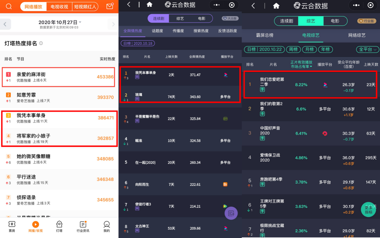 《琉璃》《街舞3》长尾效应尚在,Q4优酷剧综迎来新爆发,在《亲爱的麻洋街》《我凭本事单身》《将军家的小娘子》等多部热剧带动下,优酷“宠爱剧场”女性用户占比超7成,其中过半是90后,成为国内女性剧第一厂牌。观察类情感推理真人秀《我们恋爱吧2》,对女性情感的深入洞察引发网友共鸣,登顶云合数据综艺有效播放市场占有率榜,豆瓣评分高达7.2,口碑远超同期同类综艺。