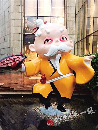 除此之外,重庆的火锅文化更是不可或缺的。唐自豪告诉记者,对此他们专门设计了‘渝馆长’的雕像。渝馆长’是其他雕塑的‘老大’,他右手端着鲜红的一盆火锅,像是要给别人吃的样子。而他的形象白发飘飘,是为了显出他的德高望重,脸庞呆萌,则是体现他卡通的可爱性。”唐自豪说。