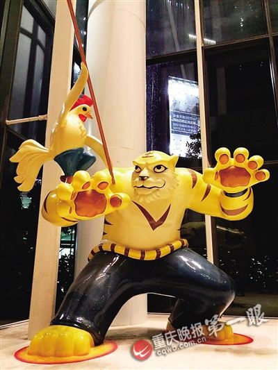 除了“卡通菜”,唐自豪他们还选择了重庆代表性的文化为创作主题。“体现文化的雕像也是跟美食联系在一起的,‘辣椒小妹’、‘茶壶和茶杯’和‘老虎棒子鸡’(乱劈柴)其实都是一种重庆本土的民俗文化。”唐自豪告诉记者,‘辣椒小妹’通体火红,火辣中带着妖娆,这一点又很有我们重庆女孩的特点。