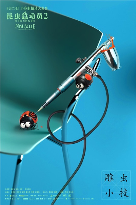 今日发布的“虫说新语”版创意海报共有4张,分别为影片中的瓢虫、蚂蚁、蜘蛛、螳螂四个角色“量身”匹配了一个成语,奇思妙想跨越国界。瓢虫版创意海报为“雕虫小技”,瓢崽儿的女朋友背着充满现代感及金属感的纹身笔,在瓢崽儿的身上“雕刻”出爱心纹样,狗粮满满溢出屏幕;相对于瓢虫版海报的温馨,蚂蚁队长的“蚍蜉撼树”则彰显了昆虫界的力量感,凭蚂蚁队长一己之力拉断粗壮的树木多少有些夸张,但这也最直观地传递了电影“小身躯撼动大世界”这一内涵。