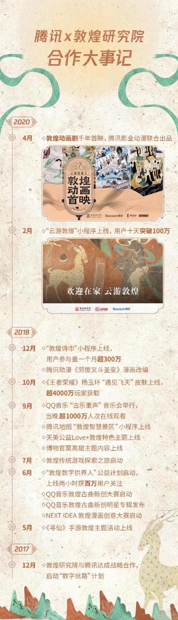 敦煌研究院与腾讯于2017年达成战略合作,双方启动了“数字丝路”计划,通过文物的保护和传播、文化价值的挖掘和梳理、文化IP的演绎和活化三个层面,打造敦煌数字文保解决方案。腾讯结合公益、游戏、音乐、动漫等数字创意方式和新文创业务矩阵,发挥互联网科技和社交平台优势,推动传统文化与大众,尤其是与年轻人的连接,进而创造性地转化敦煌文化,推动其传承与弘扬。两年间,敦煌研究院与腾讯先后推出“数字供养人” “王者荣耀飞天皮肤”、QQ音乐“古乐重声”音乐会、 “敦煌诗巾”创意小程序和“云游敦煌”小程序等一批广受好评的合作项目,推动敦煌文化的数字化创意表达。此次双方共同打造的敦煌动画剧,是将敦煌文化IP融入到年轻人喜欢的动漫、影视等流行文化形态中,表明腾讯新文创助力敦煌文化的活化传承已进入到内容创作的纵深阶段。