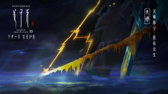 此次发布的六张动态场景概念图展现了影片中最具代表性场景。为了能够打造一个观众觉得真实可信的封神世界,电影首先采用国风特色的设计,将国画的留白艺术融入其中。例如概念图中天界的“天梯”采用棱角分明的“直线”设计,与人间北海“弯曲繁复”的线条形成强烈反差。其次,影片的每个场景在视觉风格上统一的同时,都有独特的颜色与材质。在颜色方面,“归墟”是金色调、“北海”是蓝色调等;在材质方面,天庭的金属质感更具威严,北海的木质元素更显荒凉,材质与颜色交融,更能使观众身入其境。