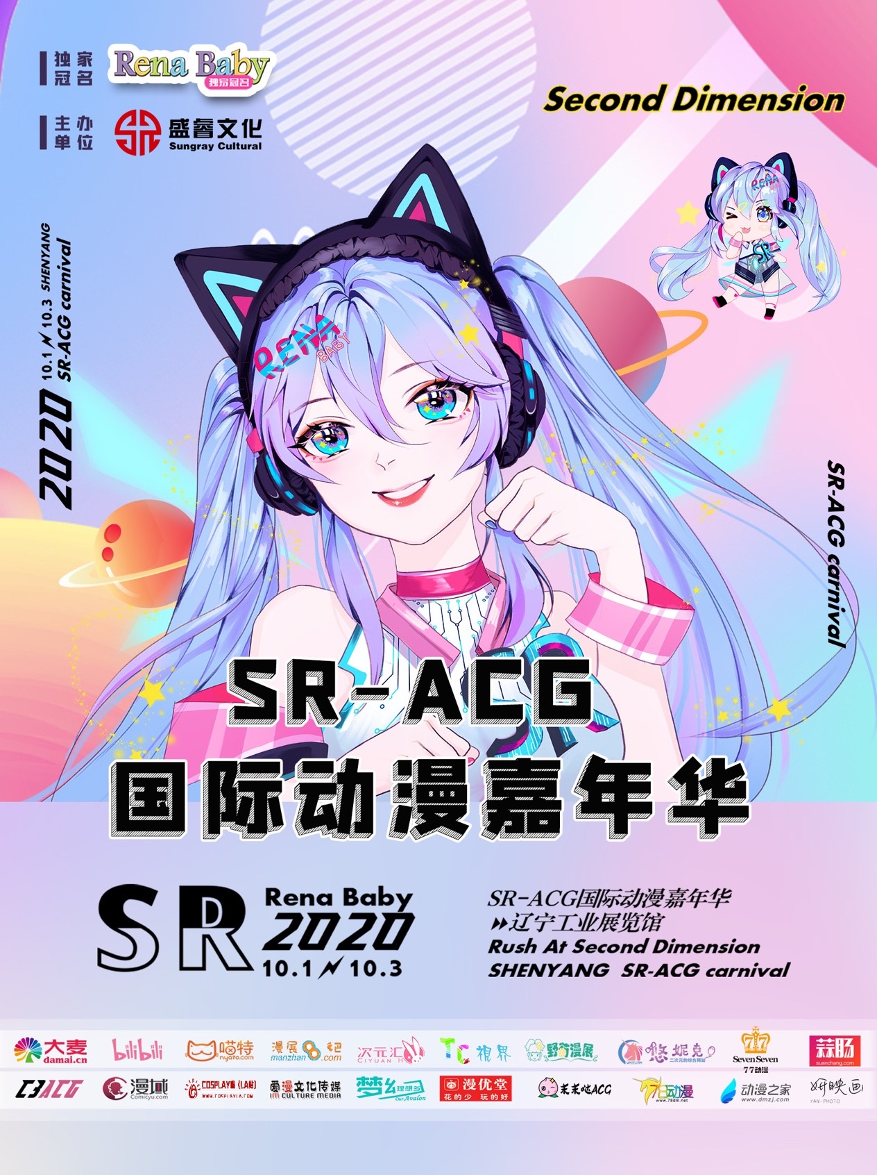 2020年10月1日至10月3日,“SR-ACG国际动漫嘉年华”正式解锁落地沈阳,在辽宁工业展览馆举办为期三天的次元狂欢盛典。本次展会结合沈阳推出地域特色内容、国潮文化,线下落地知名动漫IP,为用户带来了形式多样的泛二次元娱乐文化体验。该展会由辽宁盛睿文化传媒有限公司主办,瑞纳宝贝独家冠名,辽宁电视台、辽宁出版集团、大麦网、哔哩哔哩、网易娱乐、凤凰网辽宁、微博动漫、爱奇艺动漫等合作媒体鼎力支持。