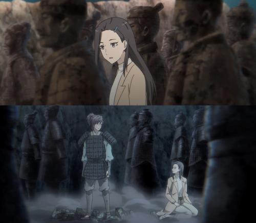 同时,动画还采用电影宽屏比例、变焦镜头,大开大合的镜头运用展示出古代帝王场景的威严和战争场景的宏大,而不少特写镜头则着重刻画了角色的情绪转变及动态场景,更具代入感和冲击力。几处古代-现代的转场更是极为精巧,衔接顺滑,在双线叙述的情况下,通过巧用转场等镜头语言,使分割在多个时空的多人命运交织在一起,将主角们跨越千年的人物命运并成一条线,最终合为一个完整的故事线。