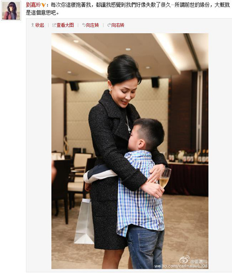 中新网11月18日电 日前,有媒体报道,刘嘉玲邀请胡军全家及林青霞、李亚鹏等好友共同为胡军儿子康康庆生,并正式认康康为干儿子。昨晚,刘嘉玲晒出现场照片,并称与康康是前世的缘分。