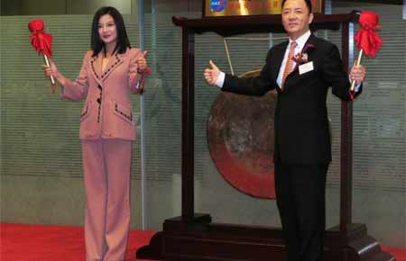 赵薇以基础投资者身份,在香港联合交易所出席入股影视公司的上市仪式。上午约九点,赵薇与行政总裁兼主席杨剑在门外合照,两人随后双双进场。