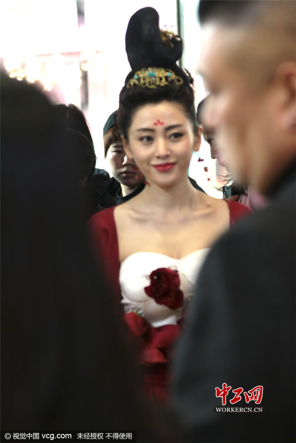 近日,张天爱上海捞金再扮“太子妃” ,头插玫瑰妆容艳丽不输武媚娘。