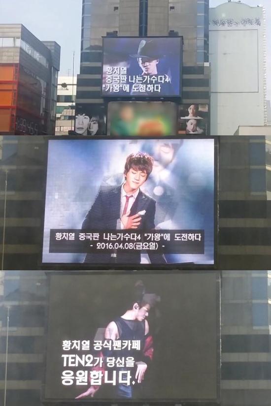 日前,黄致列的粉丝花巨资买下首尔繁华地段江南某广播屏的播映权。将从2日6时开始至9日24时每天滚动播出黄致列出战中国版《我是歌手》歌王战的宣传片,并打着大大的“黄致列,挑战没有尽头!2016.04.08歌王之战旗开得胜”字样,如此声势浩大的粉丝声援让来往行人看了也热血沸腾。