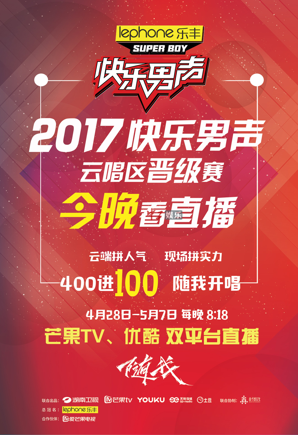 中工娱乐2017年4月28日报道 历时近两个月,《2017快乐男声》云唱区400名实力选手已经全部集结完毕,晋级赛今晚(4月28日)20:18正式打响! 400人实力角逐、鏖战10天,争夺云唱区的100强晋级席位。除了此前一直在镜头前圈粉的众多“网红”终于要走上舞台接受标准造星制度的检验之外,新鲜刺激的赛制、养眼的“挑食少女团”都成为了赛事看点,“麻辣男神”包小柏也将坐镇晋级赛,从乐评人角度给出专业意见。