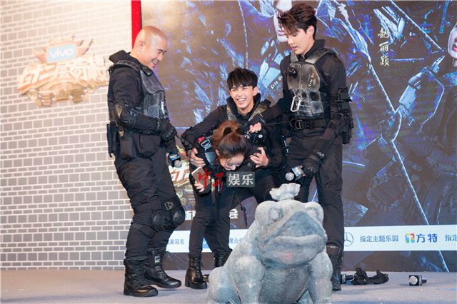 只见一只石蟾蜍身背一部手机,赵丽颖需要从一定距离外拿到手机并完成整组人的自拍。在这种及其考验明星嘉宾之间默契和协作的时刻,吴磊牢牢抱住赵丽颖,令她能全力身体外倾,最终在两人的共同配合下,才完成了考验。有趣的是,在自拍时,身材娇小的赵丽颖无法伸长手臂用手机拍全所有人,这时又是吴磊贴心的取过手机拍下了照片。如此“男友力”爆棚的吴磊引发了现场的媒体和粉丝一片尖叫声,更被冠以“黑衣骑士”的名号。