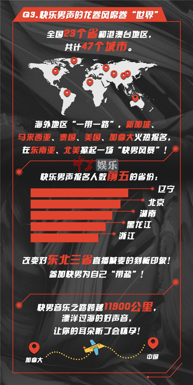 历时五个月的选拔,通过地面、合作及网络云唱区组成的全球海选大矩阵,《2017快乐男声》300强热力诞生。今年快男这场“龙卷风”不仅刮遍全国各地,更是走向了国际化:吸引了来自23个省份、47个市的中国选手参加,更有来自加拿大、美国、马来西亚、泰国、新加坡等国家的选手漂洋过海来参赛,收获了一大批有颜值、懂才艺的鲜肉小哥哥。
