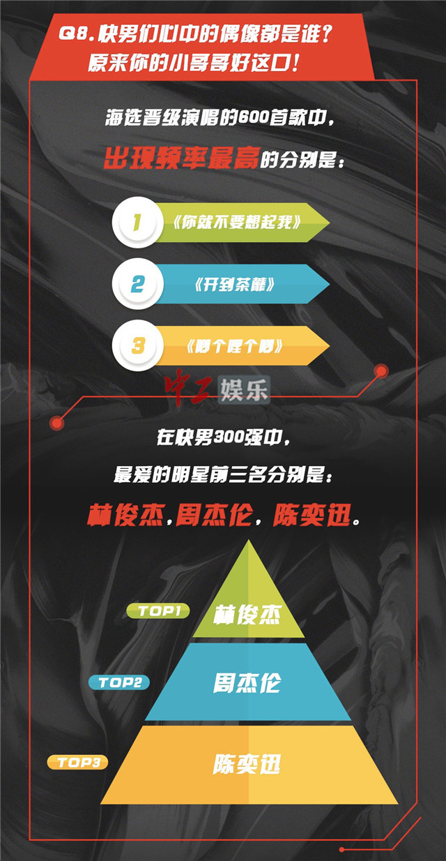 在选歌方面,让人倍感意外的是,无论地面唱区也好云唱区也罢,传唱率最高的竟是林俊杰的歌单,占比五分之一;其次是周杰伦。一位演唱林俊杰《可惜没如果》的快男选手现场表示:“林俊杰的歌需要声情并茂,更有挑战性,也更能打动台下200位挑食少女团。”