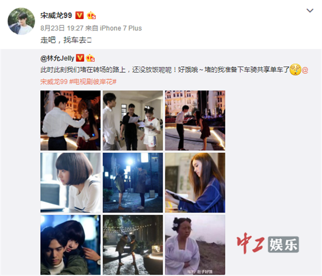 中工娱乐2017年8月24日报道 昨晚,“星女郎”林允发微博称“此时此刻我们堵在转场的路上,还没放饭呢!好饿哦~堵的我准备下车骑共享单车了”,并圈了宋威龙。之后宋威龙也在微博上进行了转发“走吧,找车去”。之后便有路透照片流出,二人在拥堵的交通中骑着共享单车。