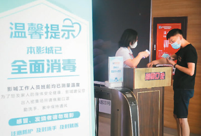 在江苏省南通市,一家影院的工作人员为进入影院的市民测量体温。