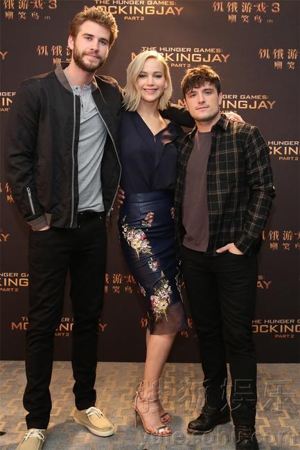 搜狐娱乐讯(森月/文 远辉/视频)《饥饿游戏》系列电影的最终篇“《饥饿游戏3:嘲笑鸟(下)》11月20日在中国上映了,“大表姐”詹妮弗-劳伦斯与两名男主角乔什-哈切特、“锤弟”利亚姆-海姆斯沃斯一起来到中国参加首映式,三个人都激动坏了。“这是我在中国首映的第一个电影!”“大表姐”詹妮弗-劳伦斯在参加《饥饿游戏》之初还只是普通少女,2013年,她因为《乌云背后的幸福线》折桂奥斯卡成为影后。她说《饥饿游戏》这个系列在她的生命中有着无比重要的地位,《饥饿游戏》的这些伙伴们也早就像家人一样。她“作证”——乔什可是个大暖男,又暖又甜。而腼腆的乔什则对最后一部的终结有很多感慨:“整个系列都要在这里有一个交代了,你会希望自己带着小手帕的,会有那样的时刻你需要它。”三人的北京之旅就是狂吃狂吃狂吃,从包子点心到宫保鸡丁,从长城脚下一直吃到城里,他们喜欢讲着自己的“梗”,互相调侃吃相,又快活又相亲相爱。