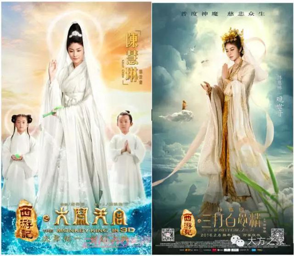 陈慧琳的观音扮相,左边为前作《大闹天宫》、右边为《三打白骨精》