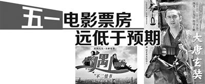 今年五一档有《北京遇上西雅图之不二情书》、《大唐玄奘》、《梦想合伙人》、《唐宫魅影》等多部新片上映,之前曾有业内人士预计票房可以达到10亿,但据“电影票房”不完全统计,五一三天全国票房7亿元,远低于之前的预期。