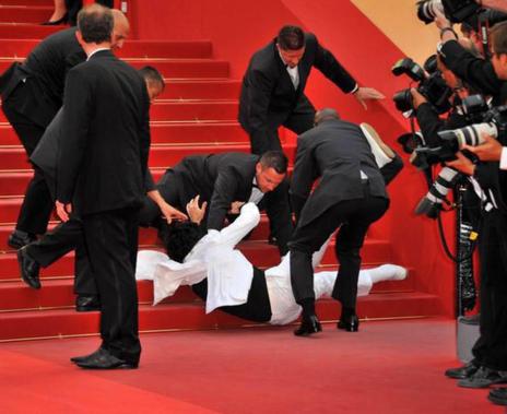 除了这些来恶搞的,还有无心插柳的。2005年5月13日,第58届戛纳国际电影节,苏菲-玛索裙子肩带滑落露点走光,春光乍现为红毯添油加醋。还有就是这位,2011年戛纳电影节上这位男子并不是在拿倒立,而是脆生地从楼梯上滚了下来。说完了这些笑话,我们接下来说点严肃的事。
