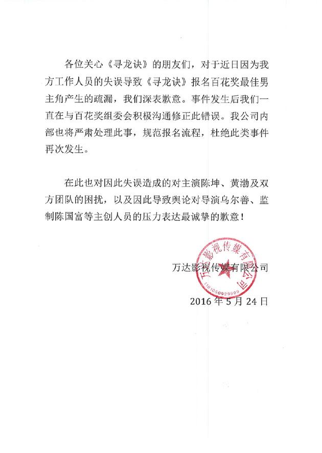 百花影帝没报名陈坤?寻龙诀片方:工作失误