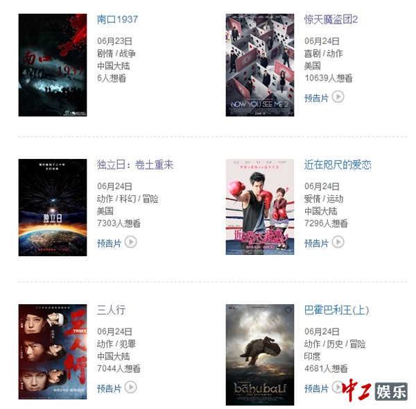 而目前从各家电商平台数据来看,貌似势均力敌的三部影片却有着明显的悬殊。在猫眼、格瓦拉、微票儿、淘票票等主流购票网站上,《惊天魔盗团2》的“想看人数”都远远超过其他两部;尤其在猫眼电影上,在《惊天魔盗团2》想看人数超过40万的情况下,《独立日2》和《三人行》的想看人数仅仅只有几万。在影迷聚集的豆瓣网上,想看《惊天魔盗团2》的人数也大大超过《独立日2》和《三人行》。