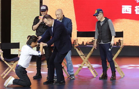 3月22日,王宝强首部自导自演的电影《大闹天竺》在京举办“西征饯行会”,王宝强变身“导演小学生”,现场跪谢与他合作过的众位导演们。