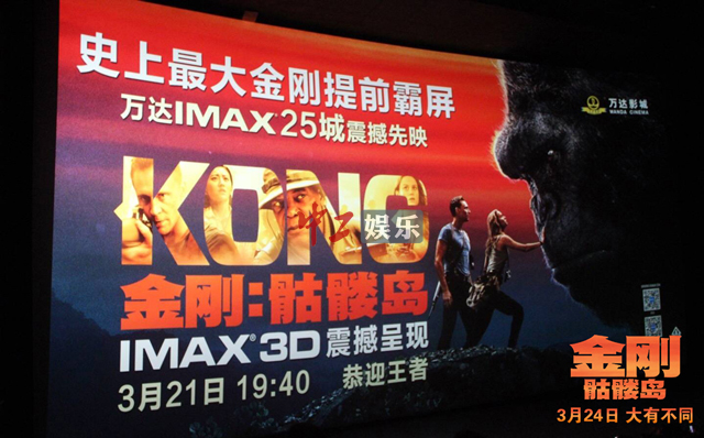 中工娱乐2017年3月22日报道 由华纳兄弟影业、传奇影业、腾讯影业出品的好莱坞动作冒险巨制《金刚:骷髅岛》于昨日在北京、上海、成都等25城举办50场超前点映,上座率高达80%,排在当日第一,可见观众们的热情之高。看片后观众也纷纷送上好评,称影片的特效极其震撼逼真,绝对是一部好看的大片!该片将于3月24日以2D、3D、IMAX3D、中国巨幕3D、杜比全景声、杜比视界、临境音制式登陆全国院线。