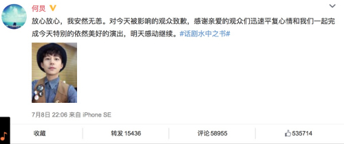 网友愤怒评论,“不管是有心炒作自己,还是太爱何老师,还是别的什么原因,这样的行为都应该受到谴责。”也有网友表示剧场保安有待加强,还有的为何炅点赞,“稍微调整一下继续演出,为他的态度叫好”。随后,何炅本人在微博向粉丝报了平安,也幽默地对“被打一分钟”辟谣:“放心放心,我安然无恙。对今天被影响的观众致歉,感谢亲爱的观众们迅速平复心情和我们一起完成今天特别的依然美好的演出,明天感动继续。”