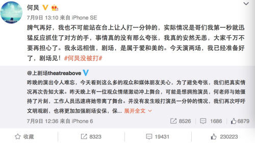 有消息曝称,7月8日晚,何炅在上海演出话剧时,一名女观众突然冲上舞台对其进行“厮打”,“持续时间将近一分钟”,直至工作人员将她强行带去后台,何炅也在回后台稍事调整后,重新到舞台继续演出。