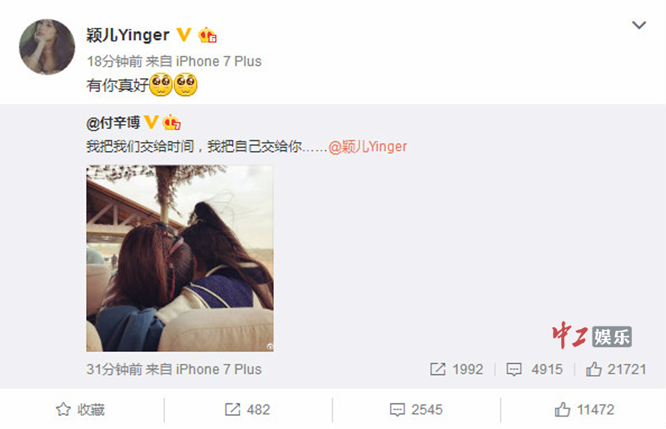 颖儿付辛博甜蜜公布恋情 七夕前夕猝不及防发“狗粮”