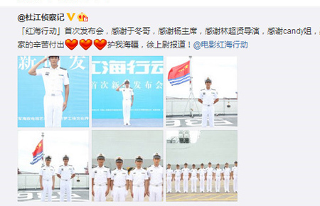 7月9日,杜江出席新电影《红海行动》发布会,一身白色海军装造型亮相发布会现场,皮肤黝黑,英姿飒爽,尽显海军风范。其同窗好友陈赫在微博犯花痴:杜江! 好帅!连霍思燕都忍不住调侃:感谢导演给我换了一个老公!
