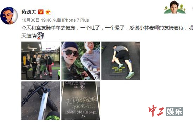 蒋劲夫骑单车外出健身接地气 同友人玩自拍心情佳