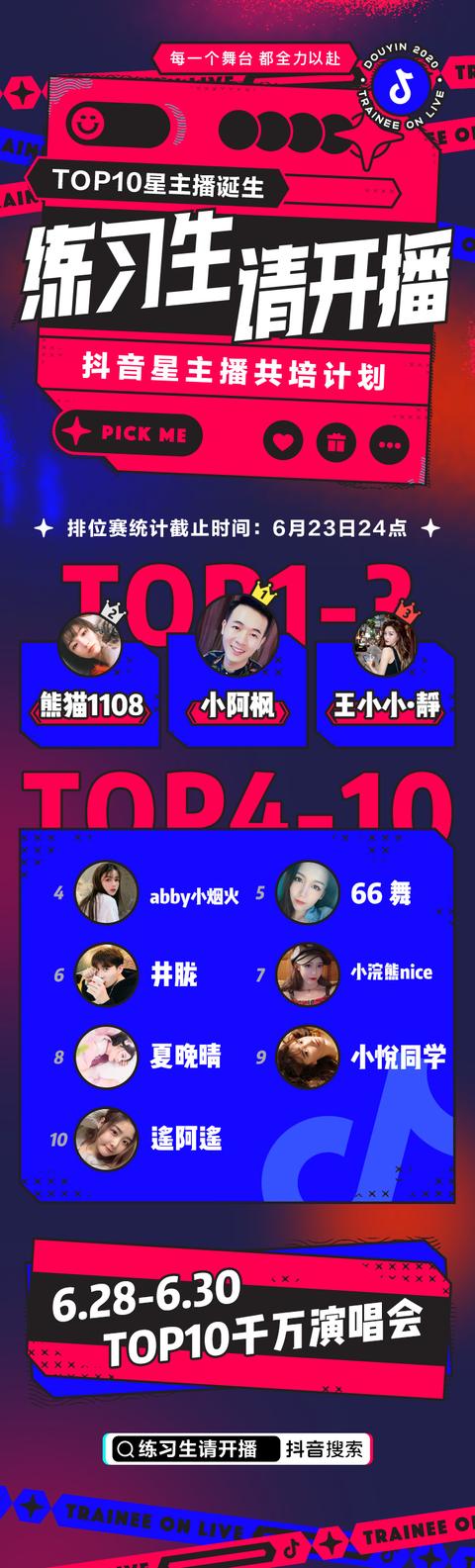 抖音《练习生请开播》借助经纪公司合作与自身流量扶持,配合实力明星导师阵容致力打造抖音头部主播,为缺少演出机会、曝光渠道和大众关注的选手们贡献了一条新的造星模式。最具明星潜质的十位主播开启续航待命模式,阶段性流量奖励、经纪公司签约机会、明星同框合作机会、晚会综艺上屏机会、顶尖杂志拍摄机会、头部媒体专访机会共同勾勒出星梦之门的一角,1000进10的"残酷"赛制只为选出蕴藏无限可能的未来星主播。TOP10榜单只是这条星路的起点,抖音练习生共培计划已经进入尾声,但属于练习生们的精彩,注定才刚刚开始!