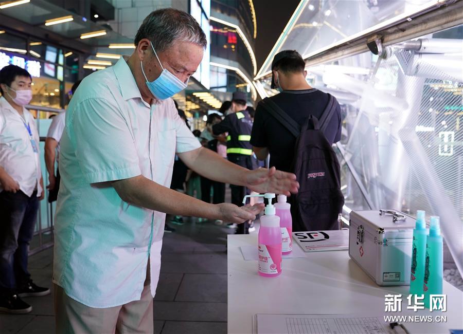 7月25日,在上海大宁音乐广场,观看露天电影展映的观众在入场前清洁手部。 当日,第23届上海国际电影节拉开帷幕。除影院展映外,本届电影节首次推出露天展映,覆盖上海7个商圈和30多个社区。 新华社记者 刘颖 摄