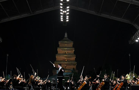 19日晚,一年一度的西安交响乐团户外公演在西安市大雁塔北广场上演,让古典音乐走向群众身边。