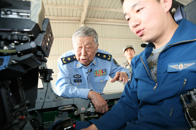 2010年5月13日,阎肃在空军八一飞行表演队参观,和飞行员亲切交谈。