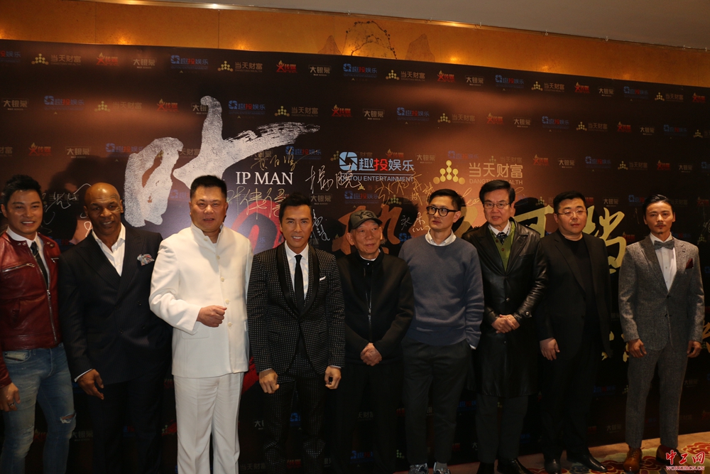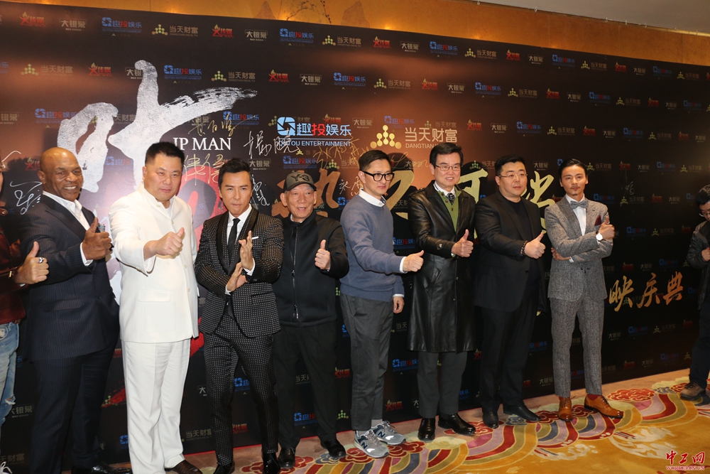 中工网讯 3月1日下午,《叶问3》北京“势不可挡”,3D功夫巨制《叶问3》首映礼在北京隆重举行。《叶问3》由施建祥任总制片人,叶伟信执导,黄百鸣监制,袁和平任动作导演,甄子丹、张晋、熊黛林、谭耀文、陈国坤领衔主演,泰森特别演出,杨子担任宣发人,北京大银幕总发行,火传媒联合宣发,四海发行联盟联合发行、北京星美影视联合发行。首映礼现场,总制片人施建祥、监制黄百鸣、导演叶伟信携主演甄子丹、张晋、陈国坤、谭耀文亮相,一代拳王泰森也不远千里飞赴北京捧场首映礼,本组图片为各主创为《叶问3》造势签名。
