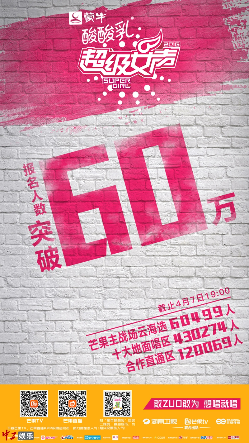 中工娱乐4月11日报道 自3月12日《2016超级女声》步入全面海选阶段后,数十万怀有音乐梦想的女生纷至沓来。目前,芒果主站、十大地面唱区、合作直通区报名总人数已超61万。历经一个月,三大渠道海选均已进入尾声,超61万选手中仅有300位能够脱颖而出,聚首《超女》大本营湖南长沙。