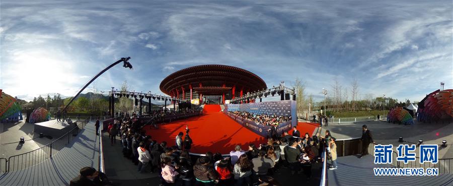 4月16日拍摄的开幕红毯现场(全景相机拍摄)。当日,第六届北京国际电影节在北京怀柔雁栖湖国际会展中心开幕。 新华社记者王建华摄