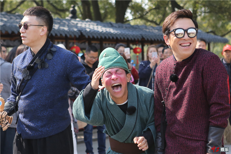 话说重聚的“极限男人帮”这次来到古色古香的无锡宋城,集体穿越回了三国时期。可能是古代人比较骁勇好斗,黄渤和孙红雷这对“损友”率先起了“纷争”,孙红雷将黄渤推到一边,黄渤不禁大声感叹:“三国互相杀啊!”。而孙红雷却只执着于自己眼睛大小的问题,只见他拦住一位“门内”,还不惜摘下自己挚爱的墨镜,一个劲儿的睁大了眼睛问对方:“看我的眼睛!”“看见了吗?”