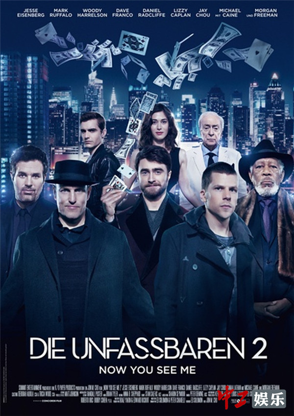 中工娱乐6月22日报道 由狮门影业重金打造,狮鼠影业协助推广,美籍华裔导演朱浩伟执导,杰西·艾森伯格、伍迪·哈里森、戴夫·弗兰科、丽兹·卡潘、“绿巨人”马克·鲁法洛、迈克尔·凯恩、摩根·弗里曼联合周杰伦、“哈利·波特”丹尼尔·雷德克里夫主演的高智商犯罪动作巨制《惊天魔盗团2》正在全球热映,国内定档6月24日正式上映。今日,片方发布了一组“国际版”海报,这版各具特色的海报“国际范儿”十足,囊括日本、法国、西班牙三国,这也与影片中酷爱全球高调巡演的四骑士气质吻合。